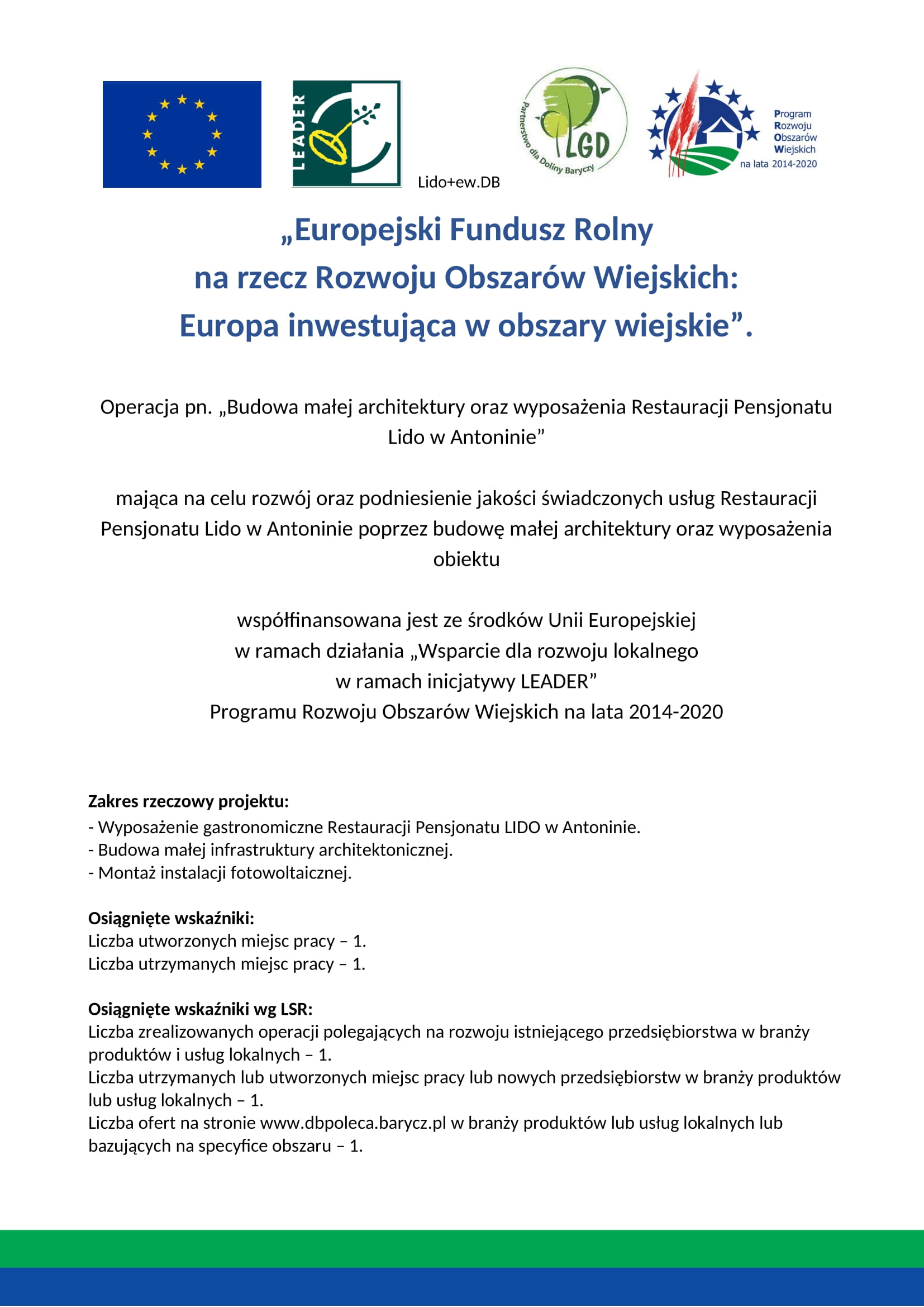 Operacja pn. „Budowa małej architektury oraz wyposażenia Restauracji Pensjonatu Lido w Antoninie”